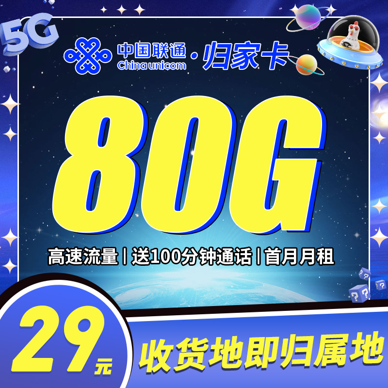 联通归家卡29元80G+100分钟套餐构成首月月租29元按天折算扣费,80G流量按天折算赠送,首冲优惠后每月29元/月,赠送的50G通用 流量+100分钟通话有效期12个月归属地本地不发地区以运营商审核为准配送方式人工上门激活方式上门激活首充渠道派送专员处或专属链接一次性充值50元办理年龄18-60岁违停复机-套餐合约12个月合约注销方式支持异地注销、营业厅注销,合约期内注销有违约金,违约金=(原