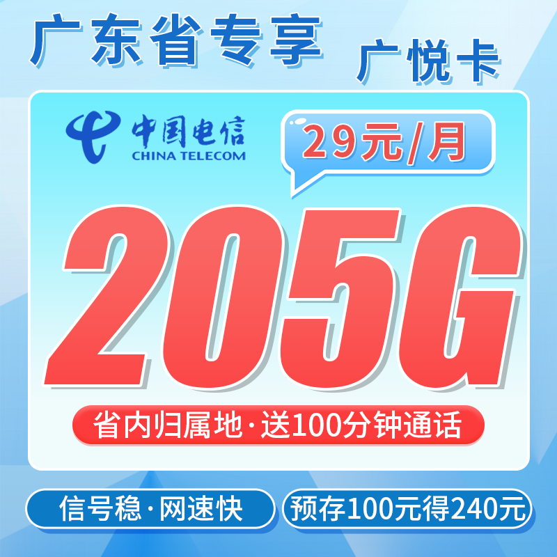 电信广悦卡29元205G全国流量+100分钟+广东专属!套餐构成首月39元205G+100分钟按天折算到账;第2-24个月29元包205G+100分钟(首充100元用户专享);第2-48个月29元包205G+100分钟(首充200元用户专享)归属地广东不发地区该卡仅发广州、东莞配送方式京东/顺丰/ESM激活方式上门激活首充渠道快递处首充100元办理年龄18-68岁违停复机-套餐合约无合约注销方式支持异地注销、当地营业厅注销、中国电信APP线上注销